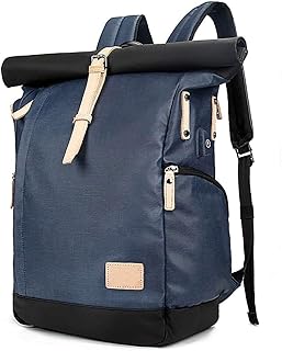 VORRINC Sac à Dos Etanche Roll Top Femme Vintage Toile Sac Randonnée Homme Loisirs College Étudiant,Sac à Dos antivol pour Ordinateur Portable Sac d'école résistant à l'eau avec Port USB (Bleu)